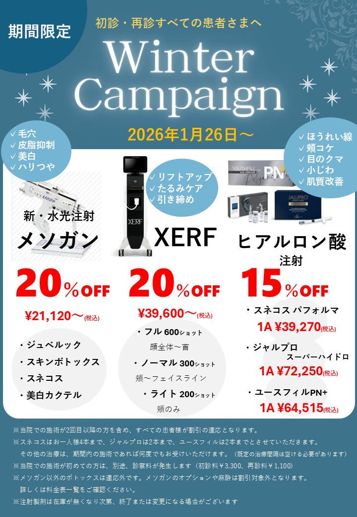 1月26日より、期間限定のキャンペーンがスタートとなります。 XERF20%OFF、メソガン20%OFF、ヒアルロン酸製剤15%OFFなど… 大変お得な期間となります!(初めての方、当院に通院されている方、すべての患者様が対象となります。) この機会にぜひ!